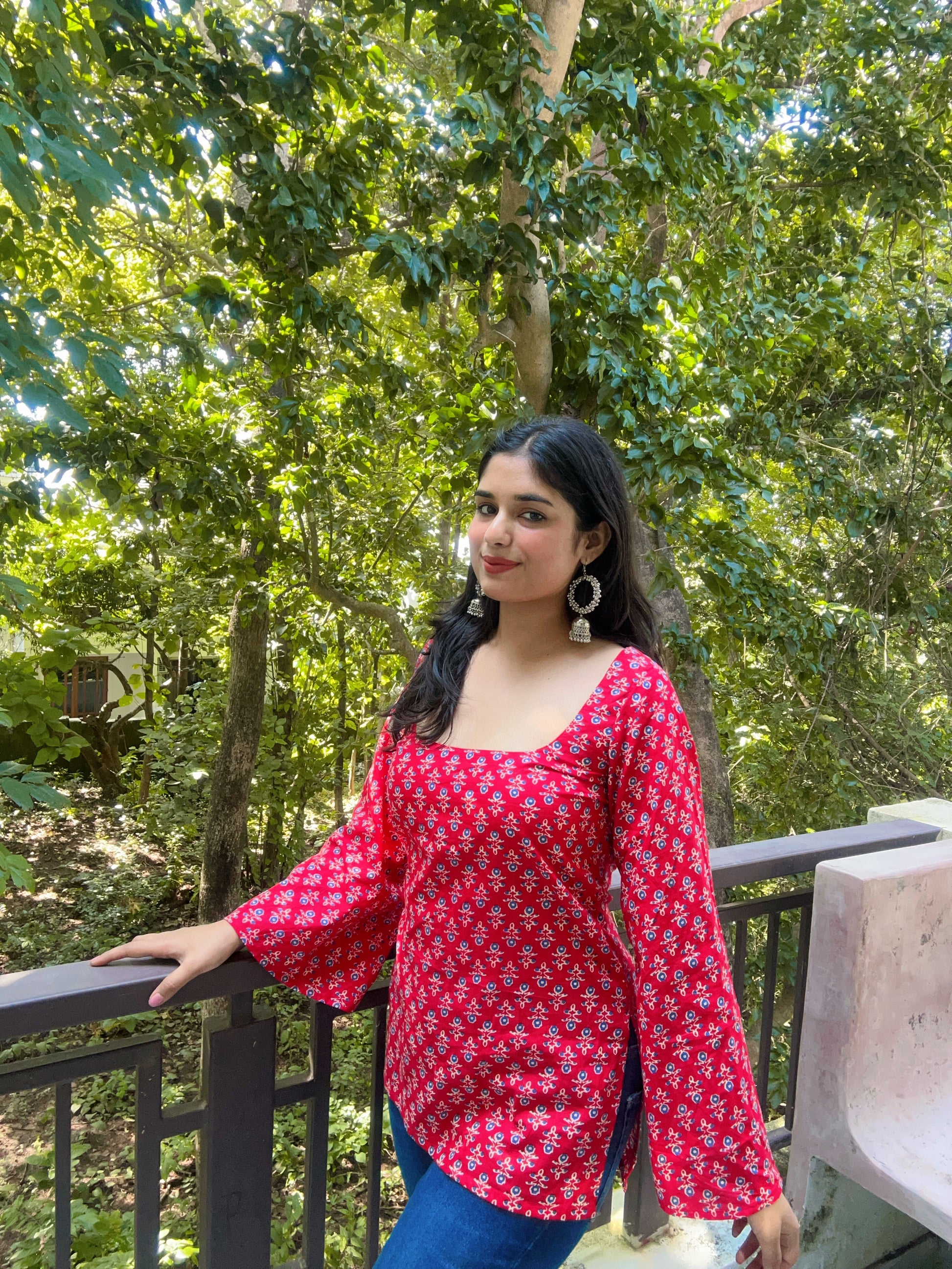 Step into a Pinterest-perfect desi look with the Marine Muse Kurti – Edition 2. Made in soft cotton with maroon block prints, it features a square deep neckline, full back corset, and flowing bell sleeves for a graceful, modern-traditional vibe.
