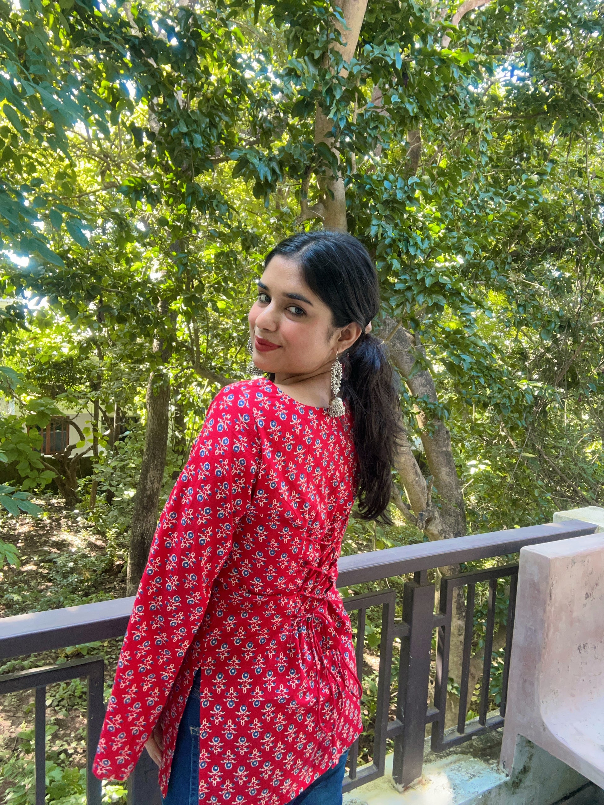 Style Note: Style this kurti with navy skirts, denim shorts, or flared trousers for a stunning Indo-fusion look. Add jhumkas for a traditional vibe or go with minimal jewelry and sneakers for a modern twist — perfect for festive, casual, or brunch occasions.