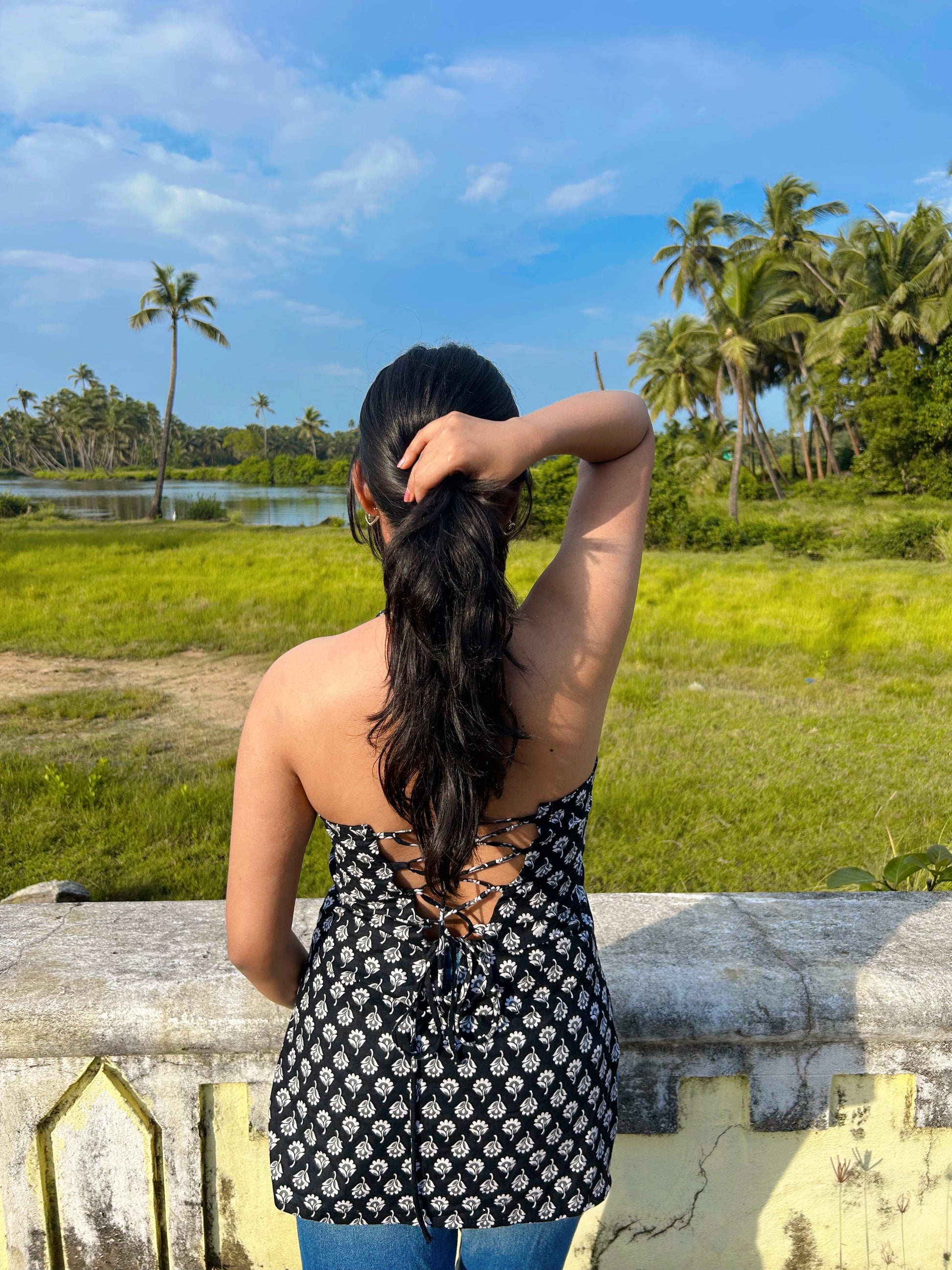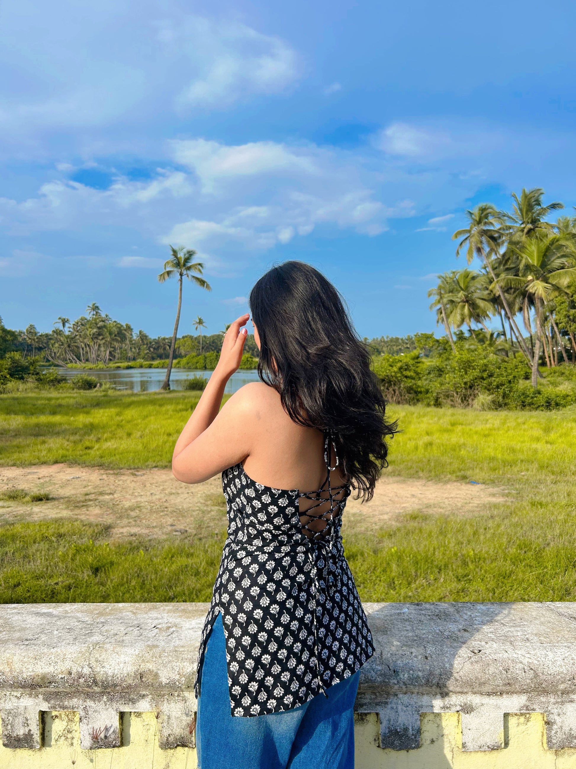 Turn heads with the Sobo Glam Kurti — a sleek black cotton piece with a halter V-neck, tie-up corset back, and flattering silhouette that blends comfort with bold sophistication.